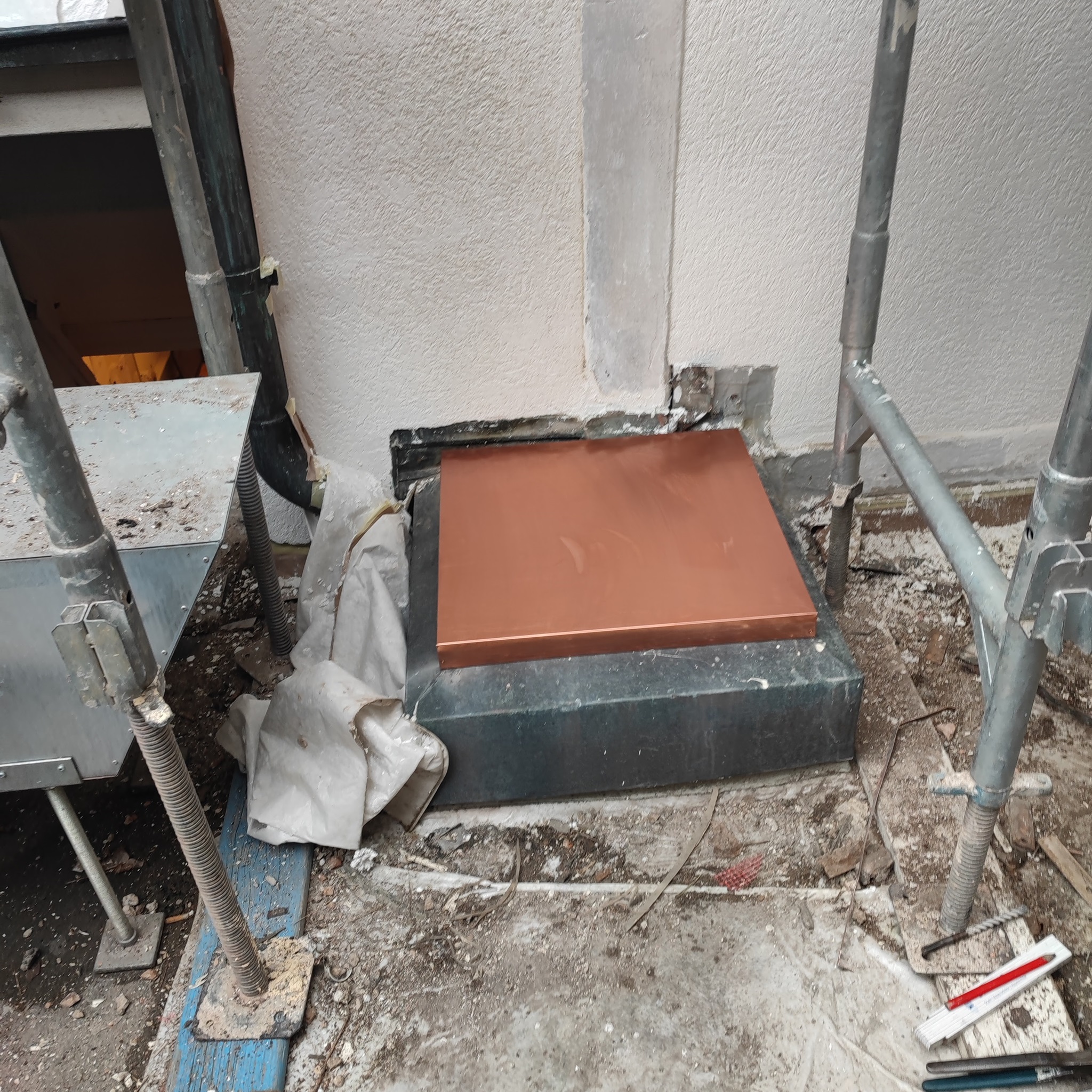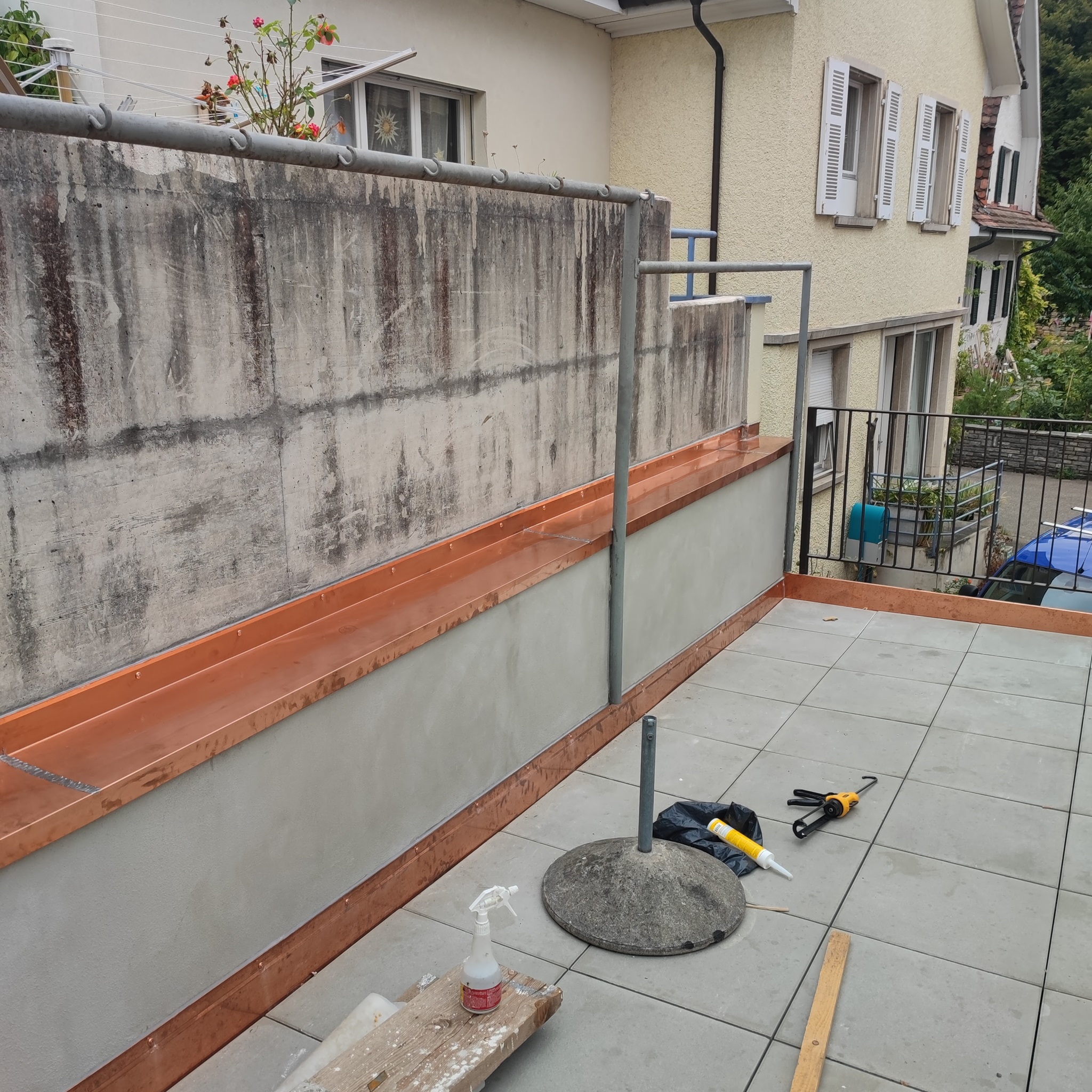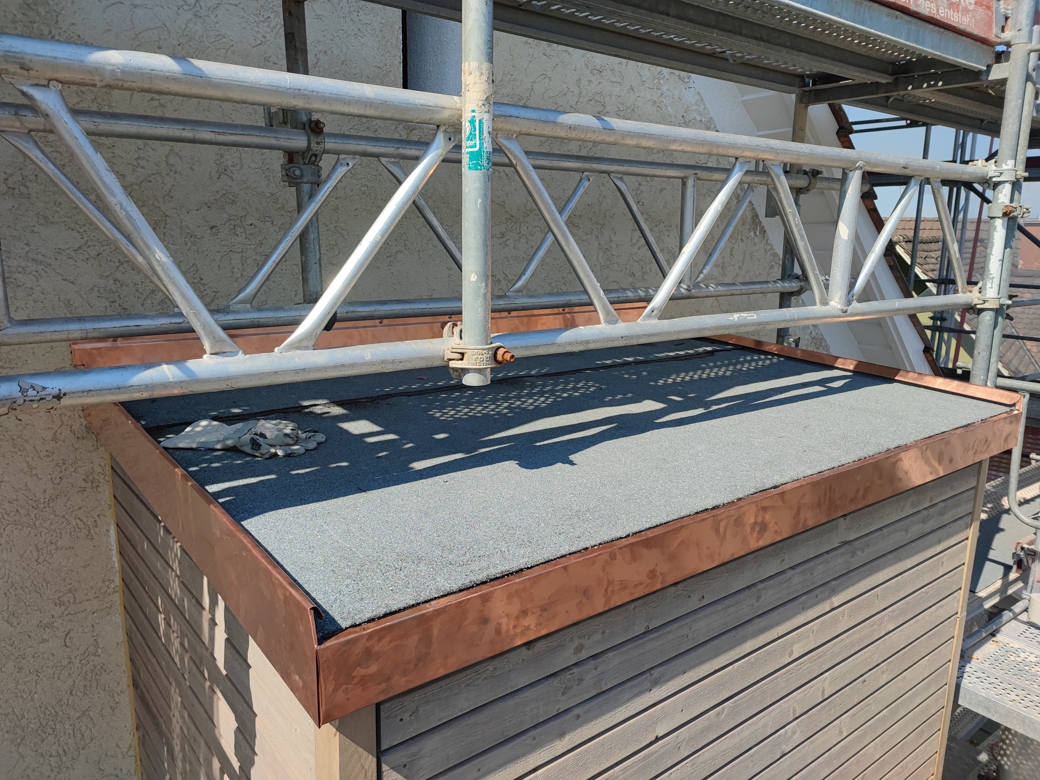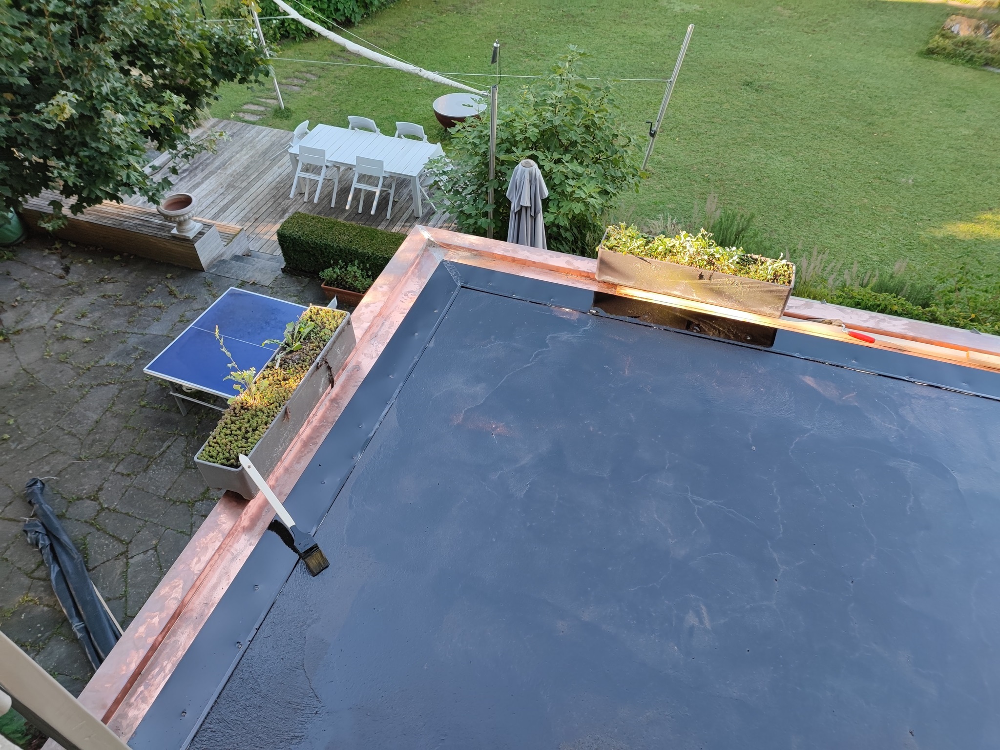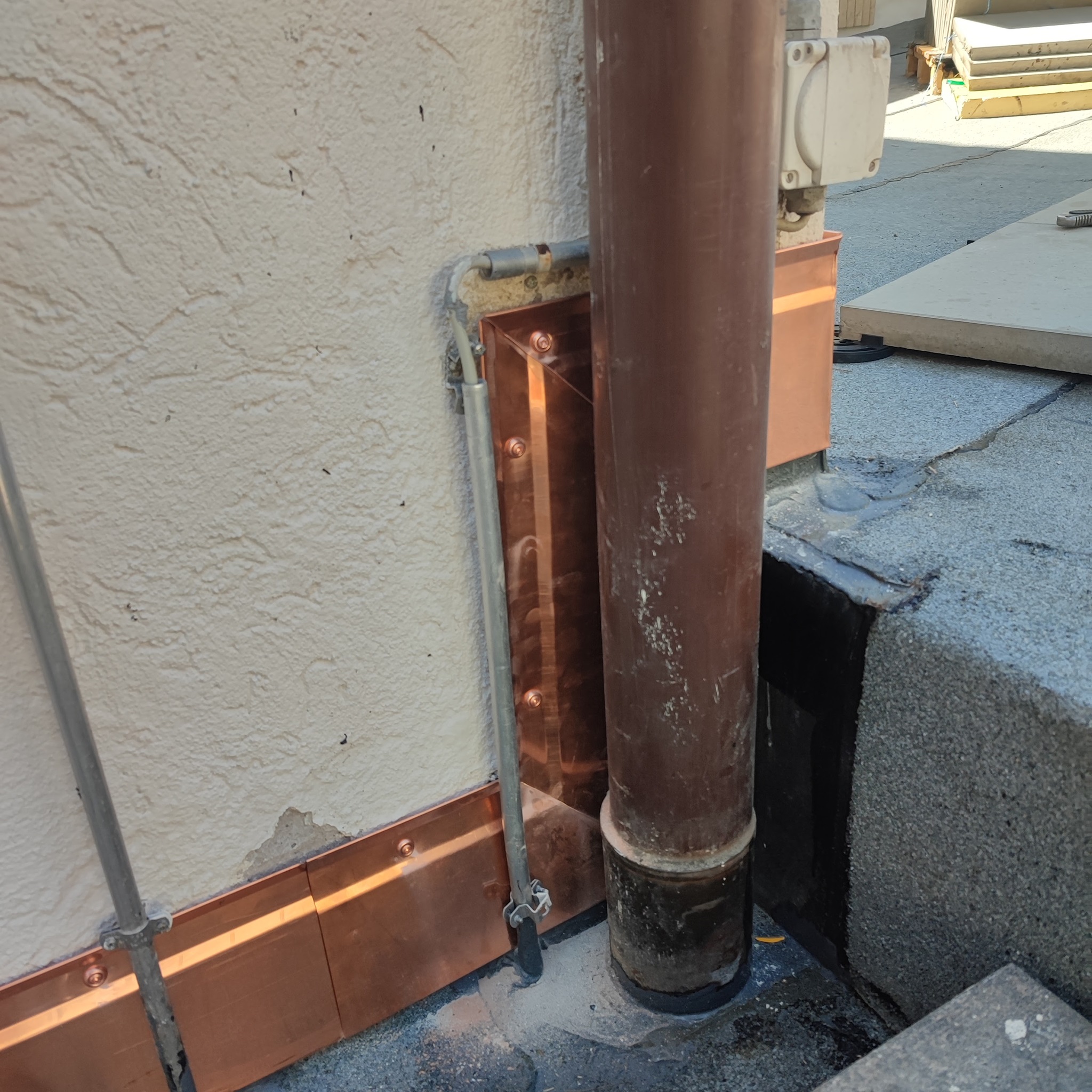 Flachdach Terrasse mit Kupfer Anschlüssen und Gartenplatten