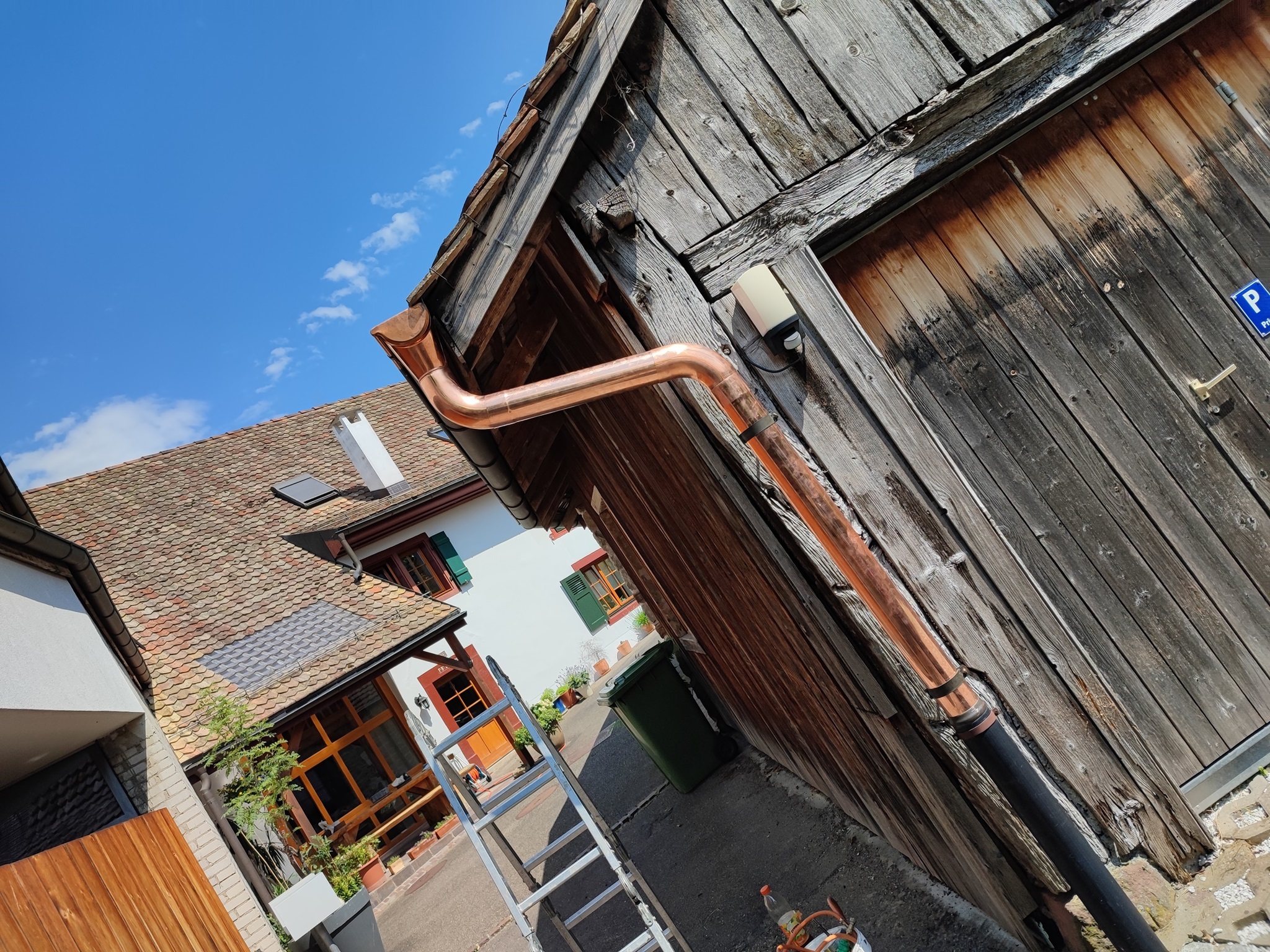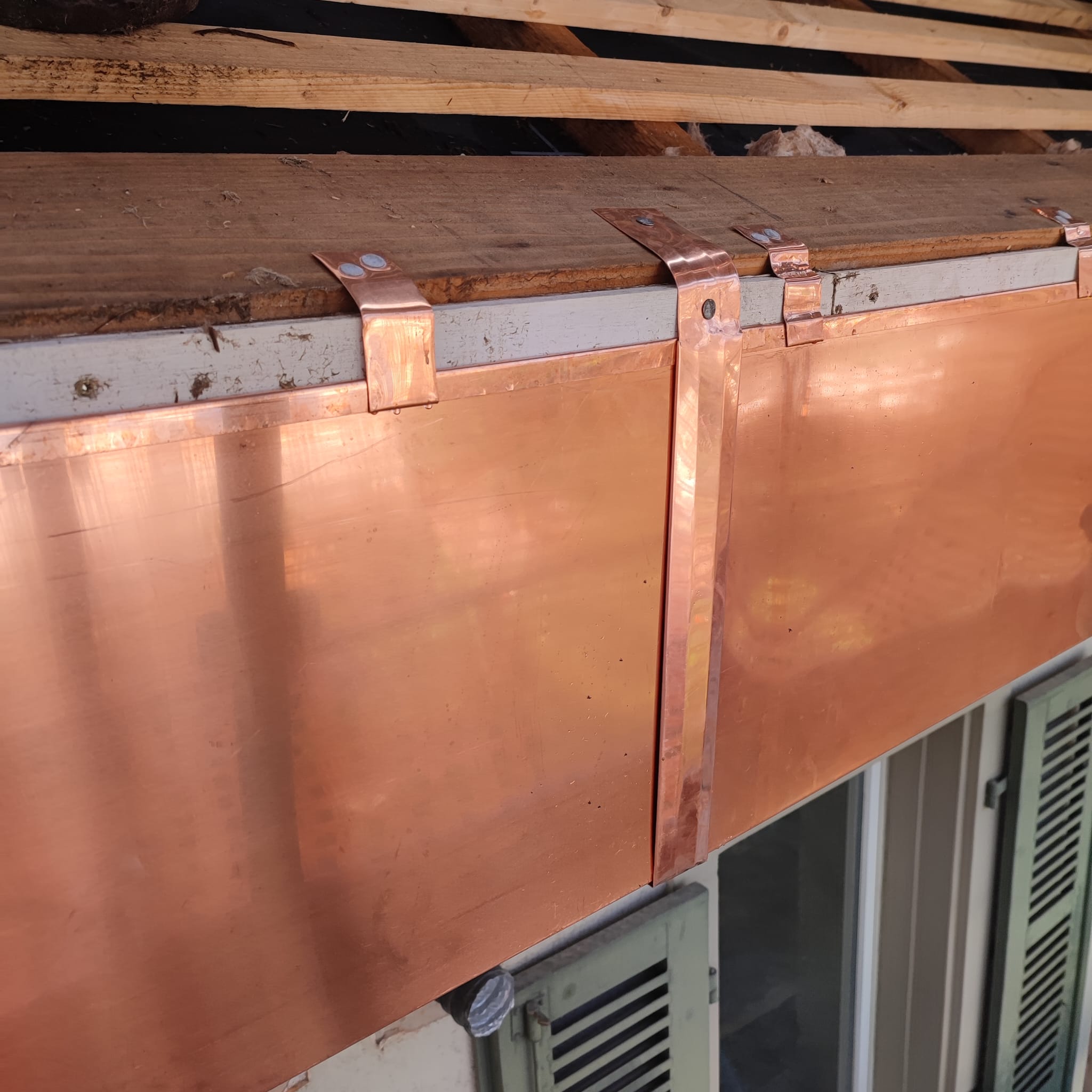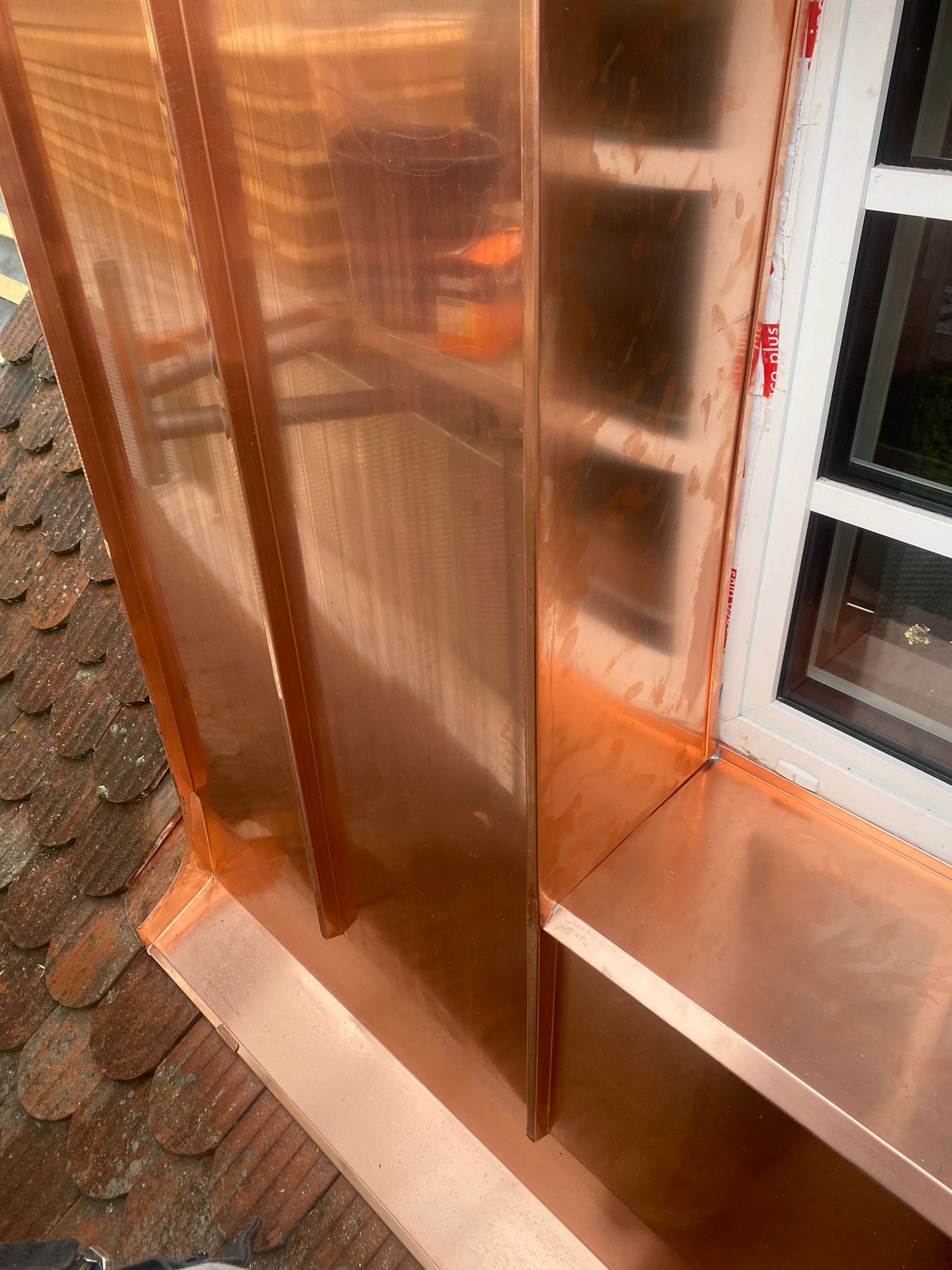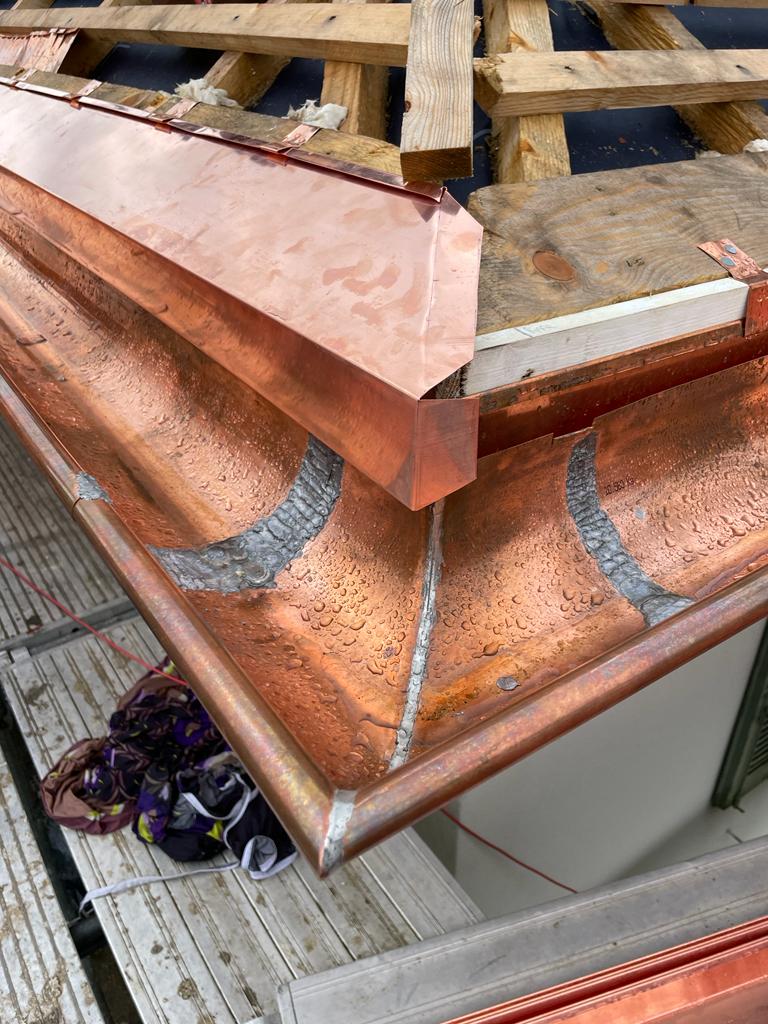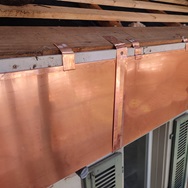 Gehrungsschnitt Rinne und Einlaufblech Kupfer